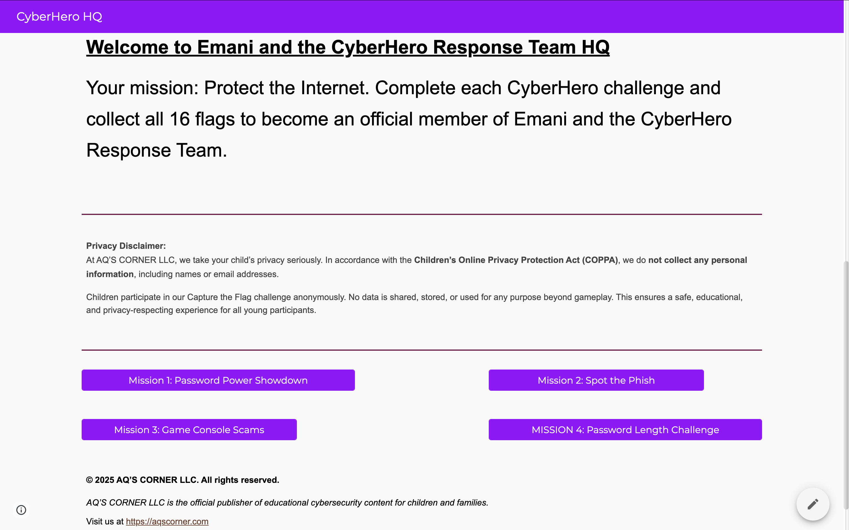 Each mission includes multiple-choice challenges, gamified instructions, and kid-friendly “flags” (safe codes or answers that mimic the traditional format). Instead of reverse engineering binary, they reverse engineering bad decisions in online spaces.