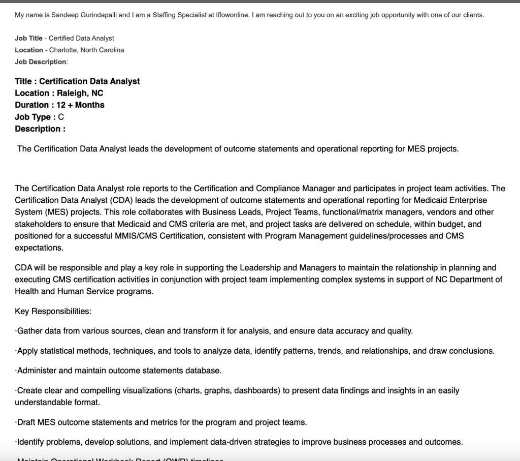 Today, I received what looked like an exciting opportunity in my inbox: a recruiter reaching out about a Certified Data Analyst position in North Carolina. The email came with a job description, a long list of responsibilities, and a request for my resume and availability.