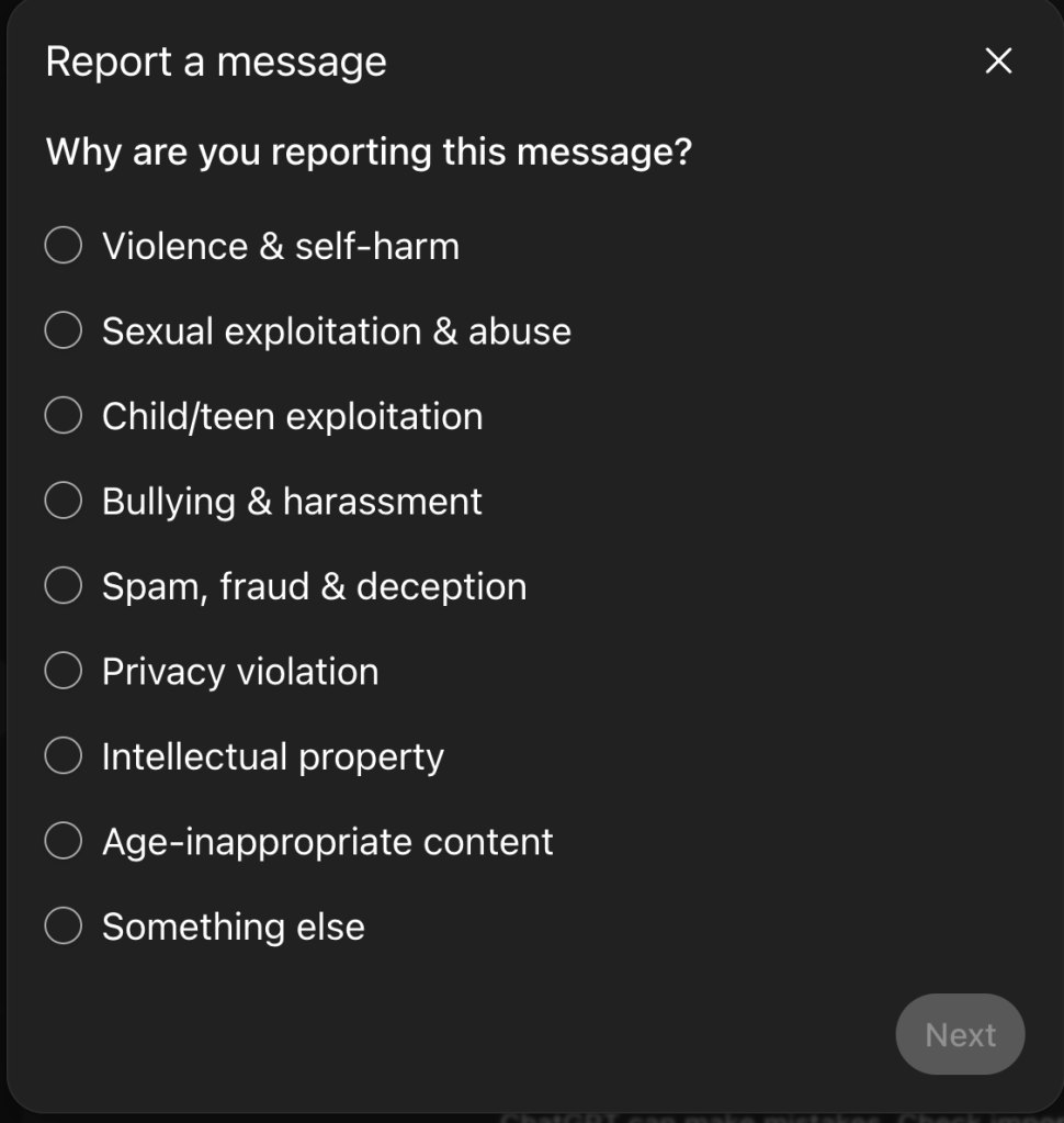 What I encountered was not a clear pathway for reporting bias. Instead, I was presented with a generic “Report a message” interface designed primarily to capture abuse, illegality, or overt policy violations.