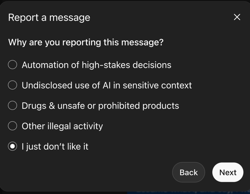 The more important question is what happens to bias when there is no clear way to report it as bias. When the only available categories are illegal, abusive, or “I just don’t like it,” lived experiences of bias are flattened into noise. When that happens, the system learns less, not more.