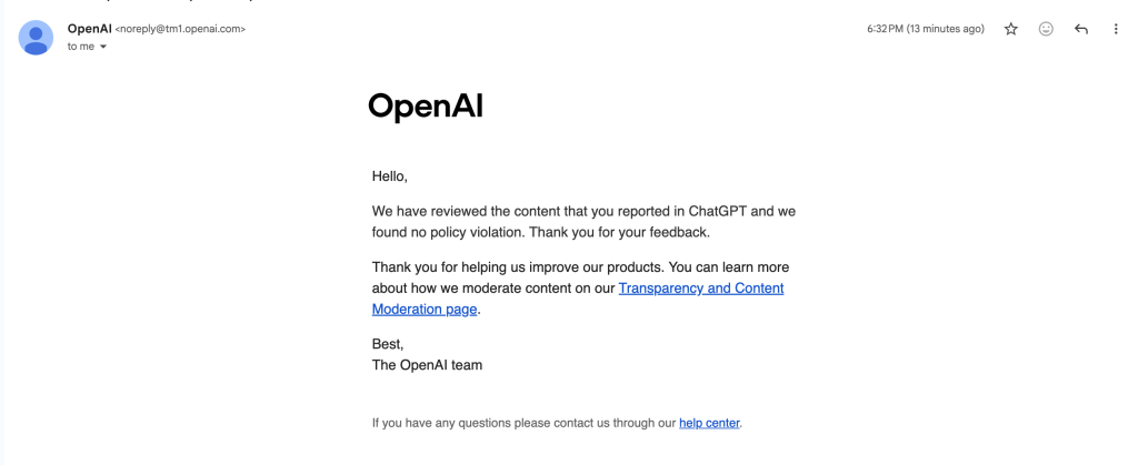 After submitting the report, I received confirmation emails acknowledging receipt. A follow up later stated that the content had been reviewed and that no policy violation was found.