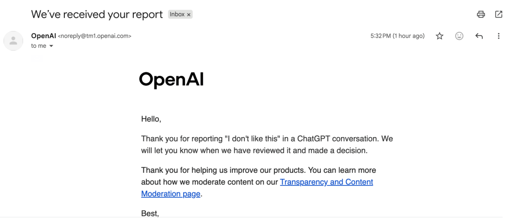 After receiving that explanation, I attempted to report the experience through the platform’s reporting mechanisms. I expected there would be a clear way to document bias encountered during normal use. What followed revealed a broader and more structural problem. While bias may be acknowledged in theory, there is no obvious place to report it in practice.