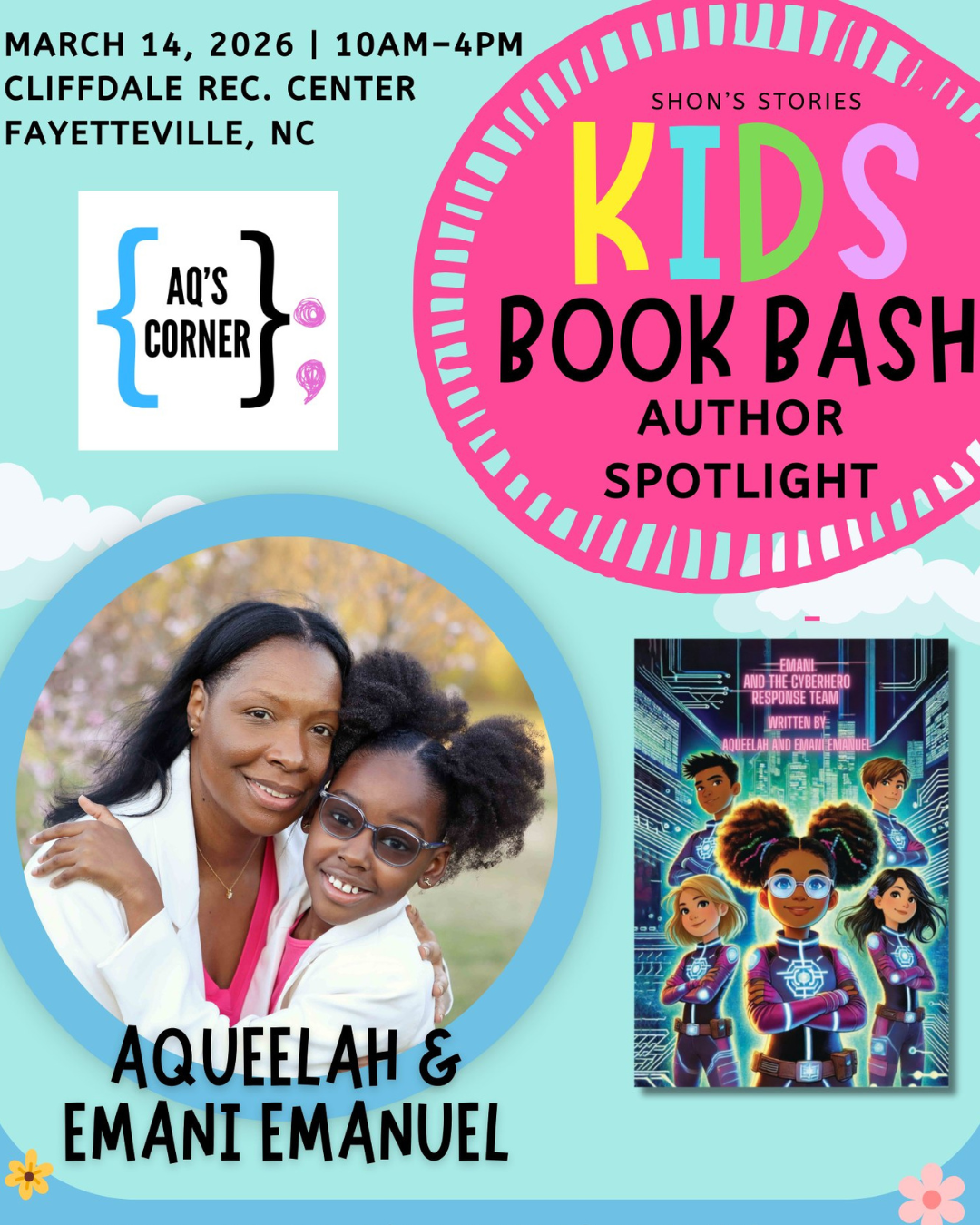 Aqueelah Emanuel, founder of AQ’s Corner LLC and co-author of the children’s cybersecurity book Emani and the CyberHero Response Team, will appear alongside her daughter, co-author and creative partner Emani Emanuel, at Shon’s Stories Kids Book Bash: Author Spotlight on March 14, 2026, from 10:00 a.m. to 4:00 p.m. at the Cliffdale Recreation Center in Fayetteville, North Carolina.