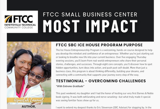 - “Our journey was spotlighted by Fayetteville Technical Community College’s Small Business Center, shared across 58 centers in NC, and included in FTCC’s annual report.”